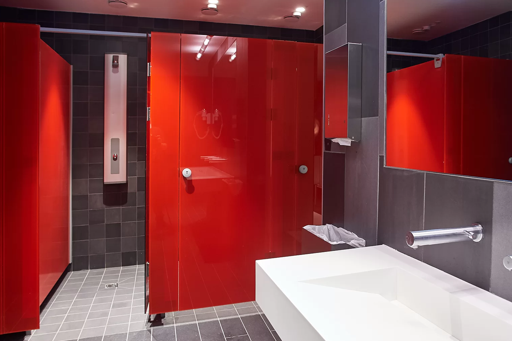 Dans le cadre d'une utilisation en sanitaires, la porte peut être fixée au mur comme une cabine de douche unique, prise en sandwich entre deux cloisons fixes, ou jointe à un panneau unique.